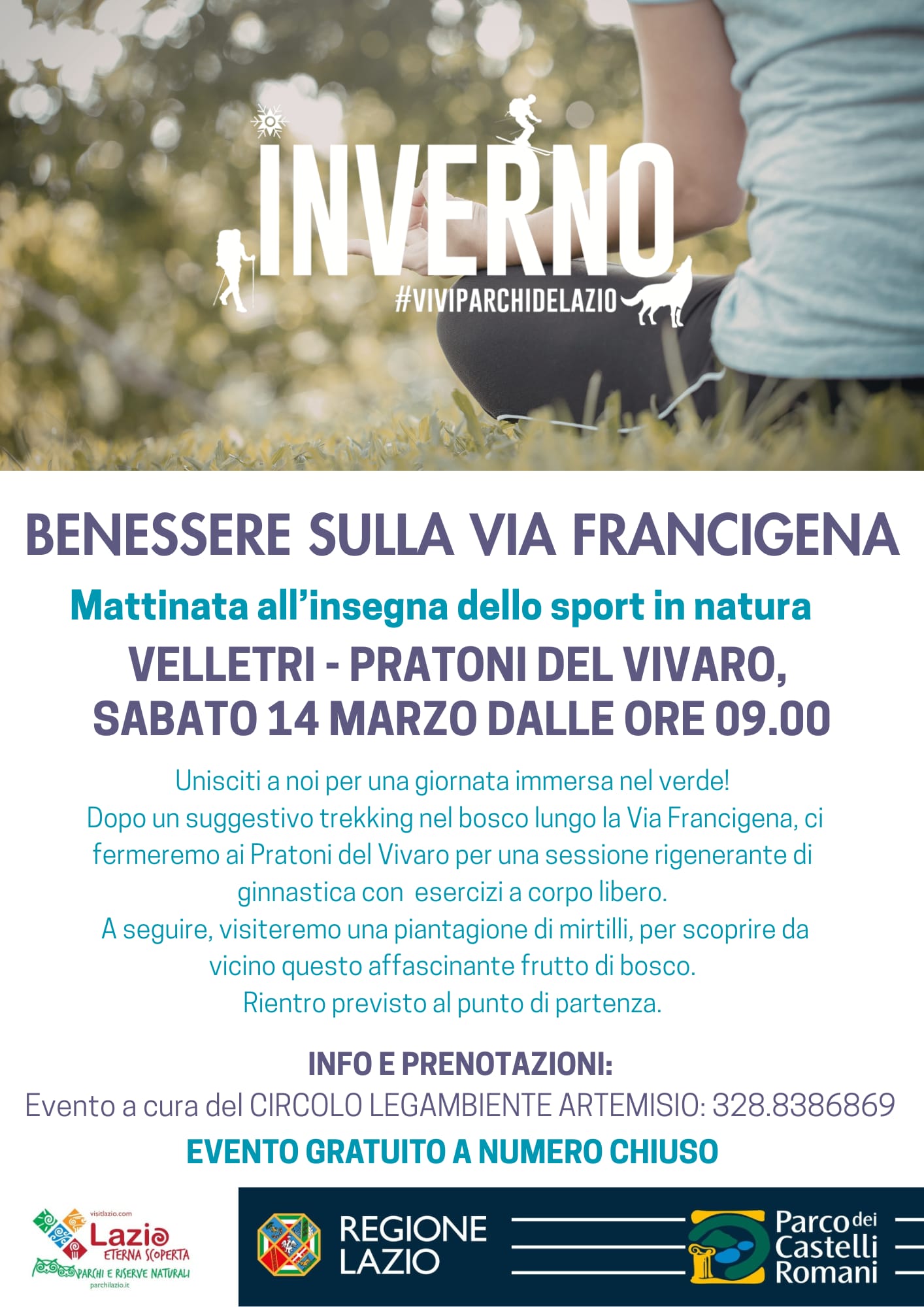 L’appuntamento è alle ore 9.00 ai Pratoni del Vivaro – Velletri (RM), con il Circolo Legambiente Artemisio, da dove si partirà per un trekking nel bosco lungo la Via Francigena, fermandosi poi, ai Pratoni del Vivaro per una rigenerante sessione di ginnastica. A seguire è prevista la visita ad una piantagione locale di mirtilli.